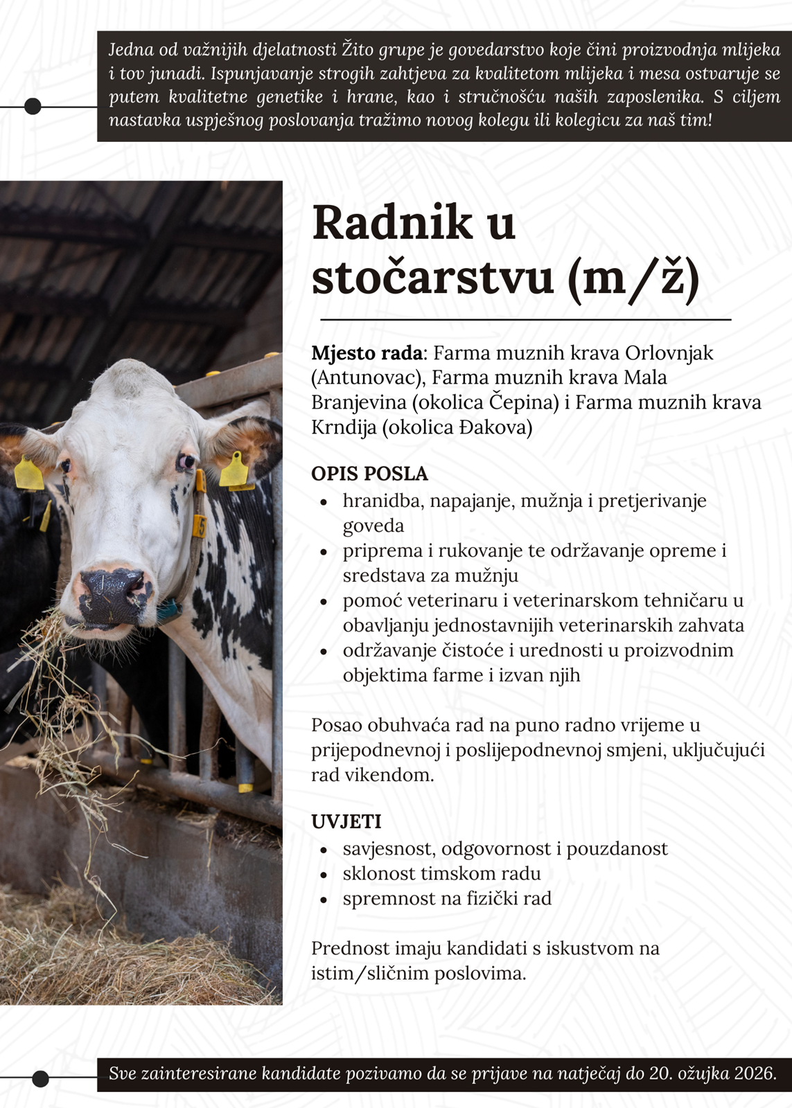 U slučaju da budete izabrani kao najbolji kandidat/kinja za određeno radno mjesto i prihvatite ponuđene uvjete, od Vas ćemo zatražiti dodatne osobne podatke u svrhe sklapanja ugovora o radu te u svrhe ispunjavanja pravnih obveza kojima kao poslodavac podliježe Žito grupa.