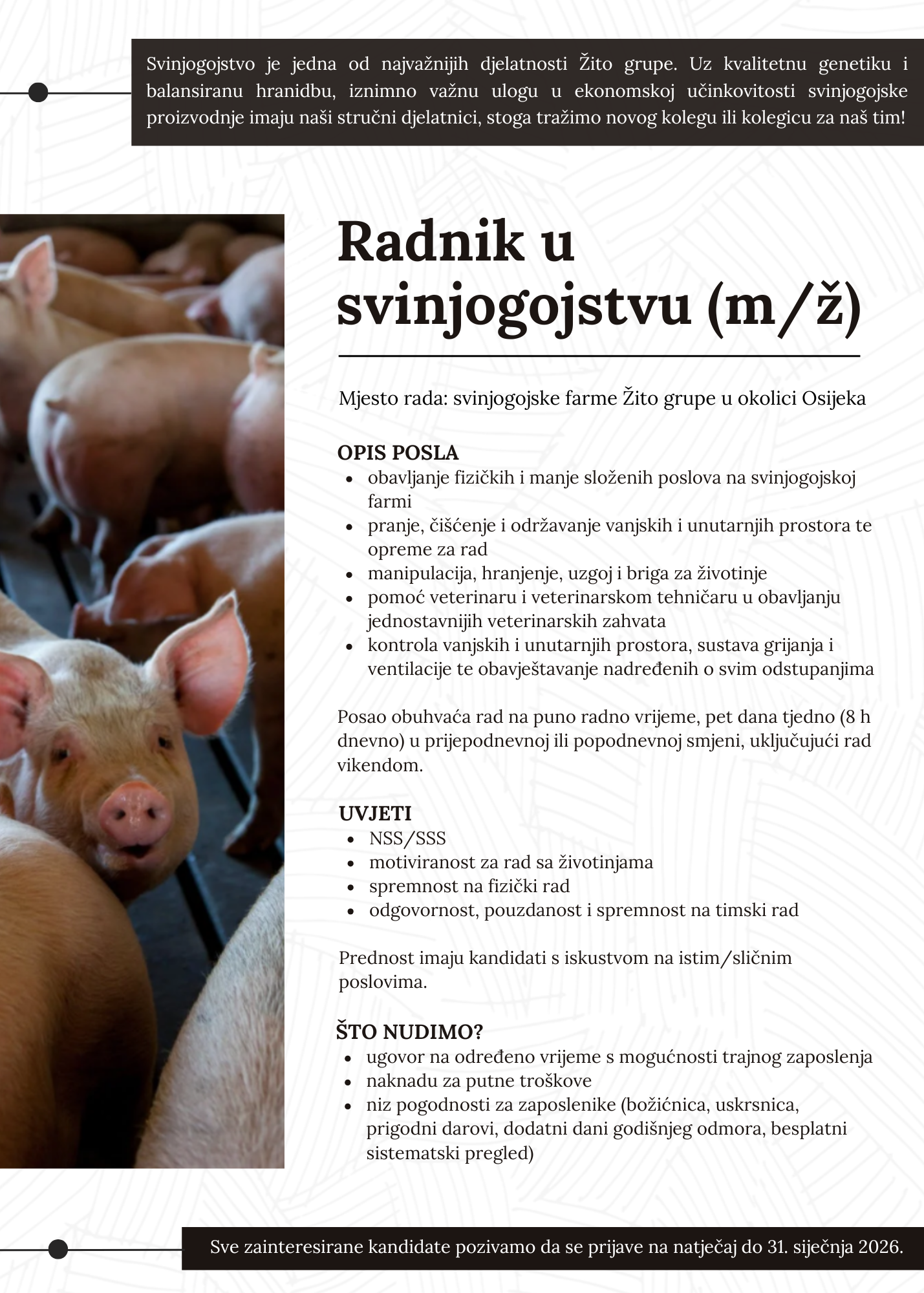 U slučaju da budete izabrani kao najbolji kandidat/kinja za određeno radno mjesto i prihvatite ponuđene uvjete, od Vas ćemo zatražiti dodatne osobne podatke u svrhe sklapanja ugovora o radu te u svrhe ispunjavanja pravnih obveza kojima kao poslodavac podliježe Žito grupa.