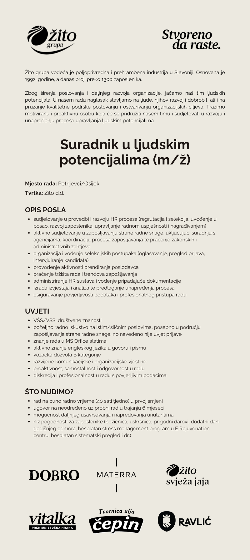 U slučaju da budete izabrani kao najbolji kandidat/kinja za određeno radno mjesto i prihvatite ponuđene uvjete, od Vas ćemo zatražiti dodatne osobne podatke u svrhe sklapanja ugovora o radu te u svrhe ispunjavanja pravnih obveza kojima kao poslodavac podliježe Žito grupa.