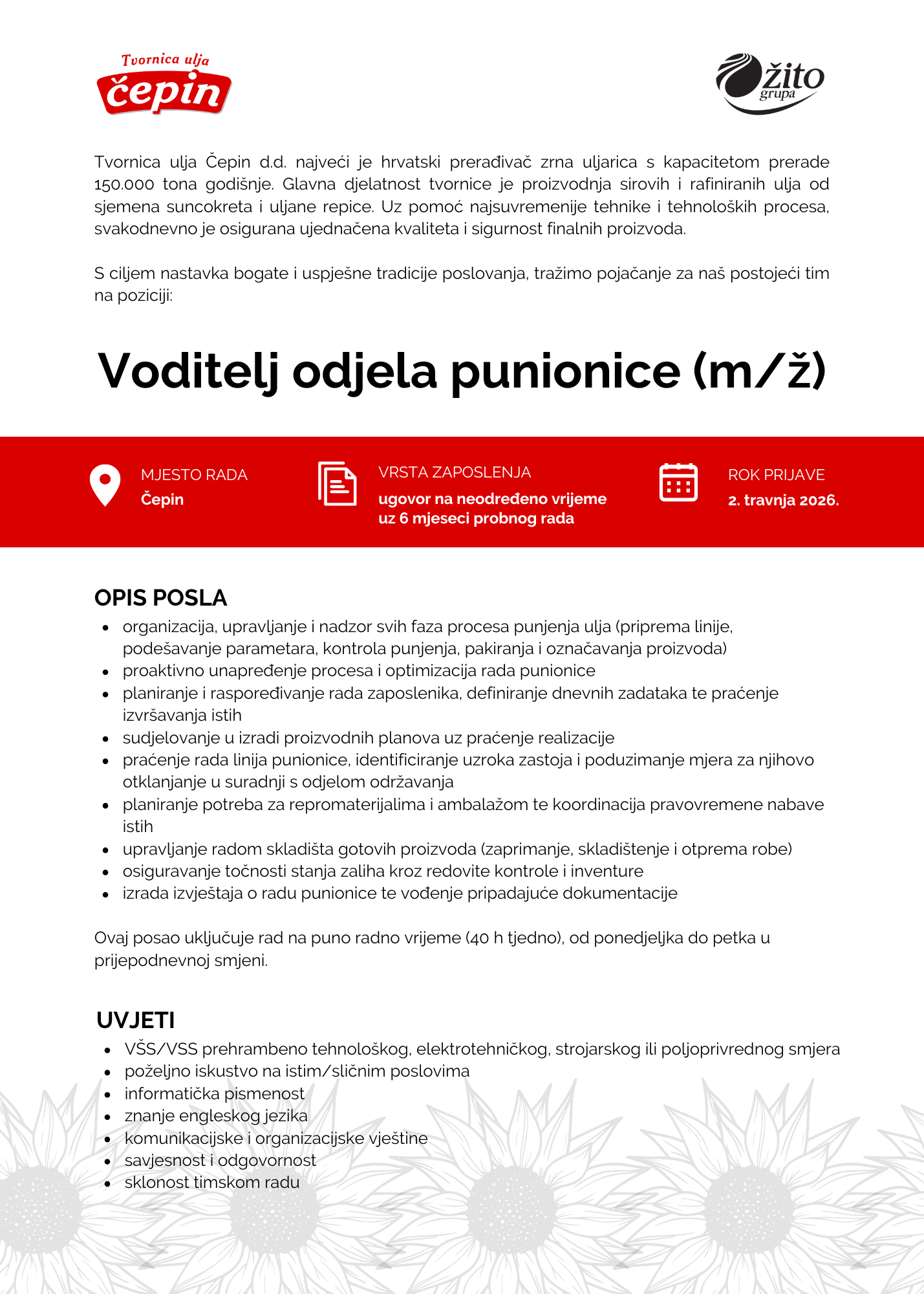 U slučaju da budete izabrani kao najbolji kandidat/kinja za određeno radno mjesto i prihvatite ponuđene uvjete, od Vas ćemo zatražiti dodatne osobne podatke u svrhe sklapanja ugovora o radu te u svrhe ispunjavanja pravnih obveza kojima kao poslodavac podliježe Žito grupa.